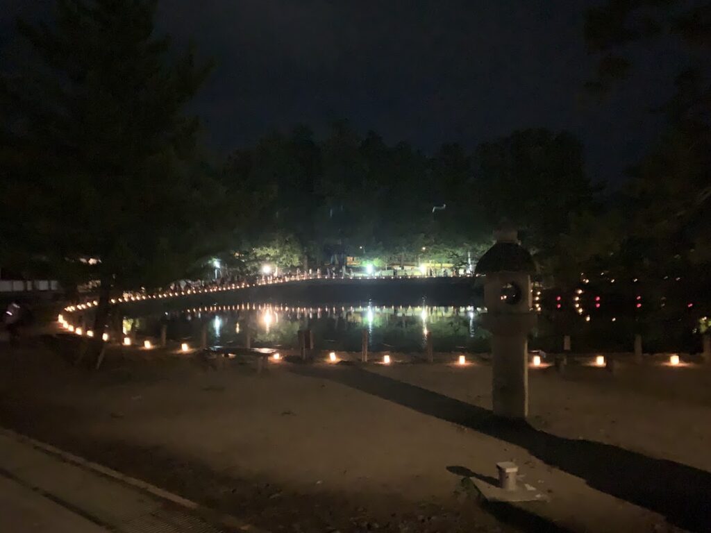 行列に並びながら右手に目をやると、鏡池が美しくライトアップされていました。