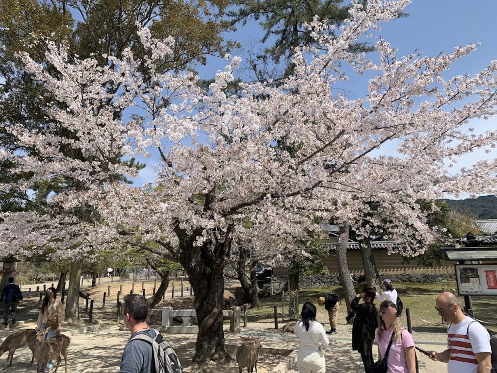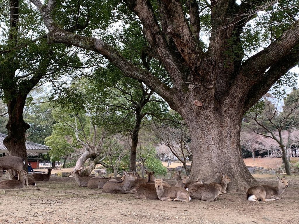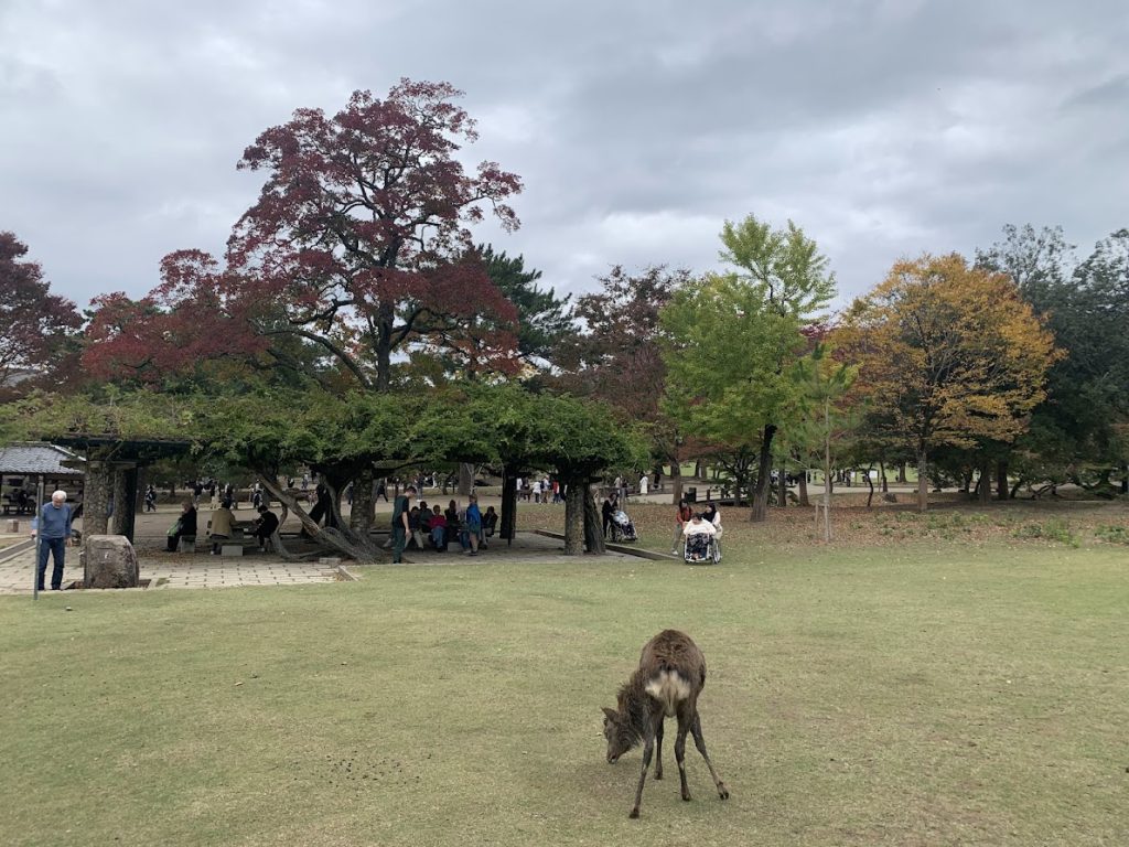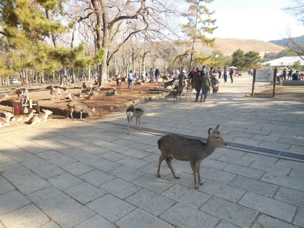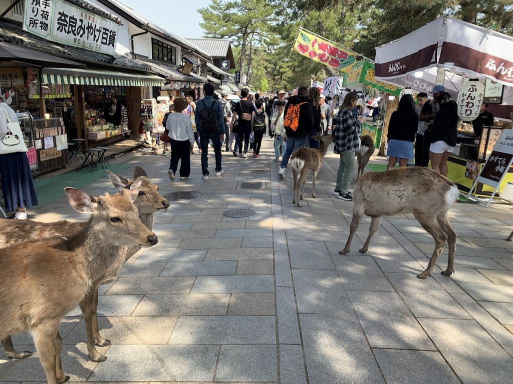 奈良公園のどこにでも鹿はいますが、特にこの辺りには、たくさんの鹿が「鹿せんべい」をもらおうと集まっています。