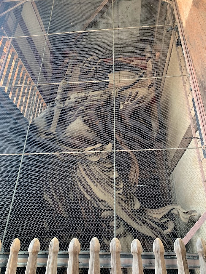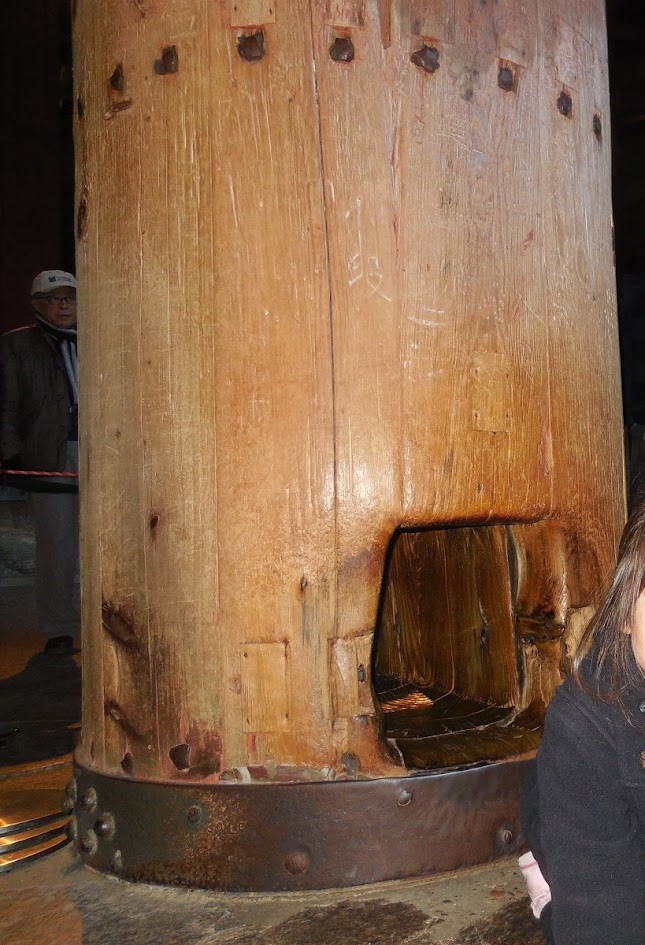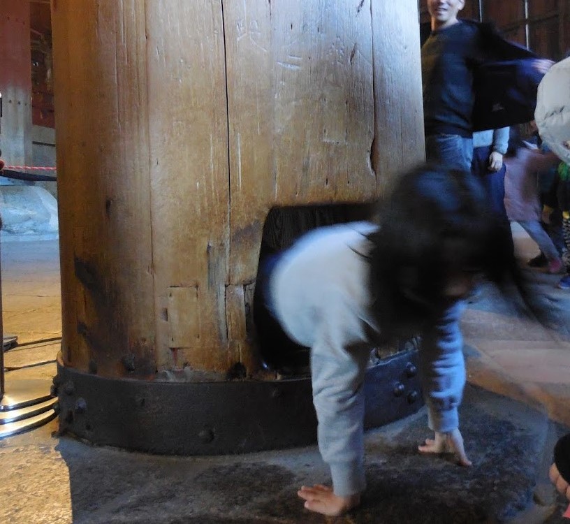 大仏さまの背後の柱には、大きな穴が開いています。この穴の大きさは、大仏さまの鼻の穴と同じと伝えられています。