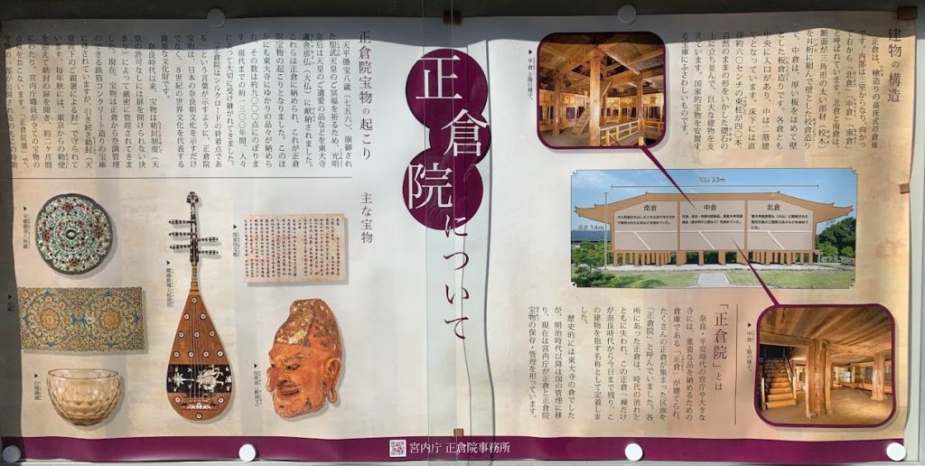 東大寺大仏殿の裏手(北側)にあります。正倉は、ヒノキ造りの高床式の倉庫です。内部は「北倉」「中倉」「南倉」の三室からなり、北倉と南倉は「校倉造(あぜくらづくり)」です。
