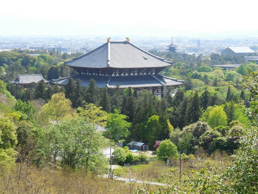 大仏殿の右側奥には、興福寺の五重塔が小さく写っています。
