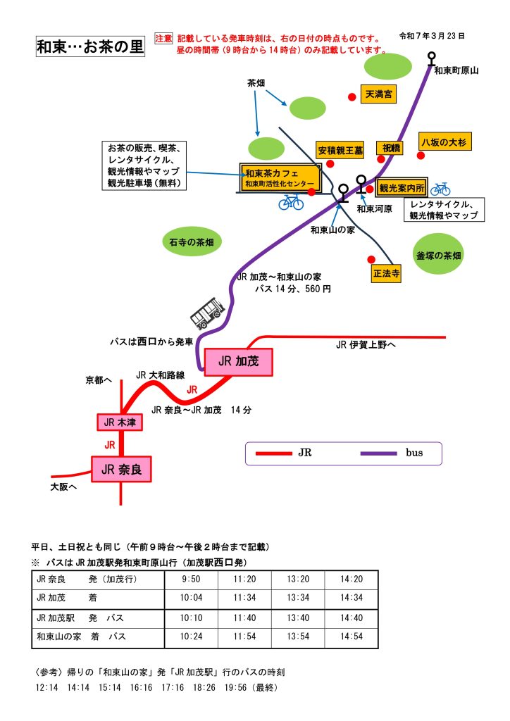 和束へのアクセス|JR奈良駅からJRとバスでお茶の里へ 行き方(奈良駅から) 2025.09.09 和束のページに戻る 注意下の文書に記載している発車時刻は、文書右上の日付の時点のものです。当日の発車時刻はぜひ、ご自分で確認ください。特に、便数の少ない交通機関は、十分にご注意ください。なお、発車時刻は昼の時間帯のみ記載しています。