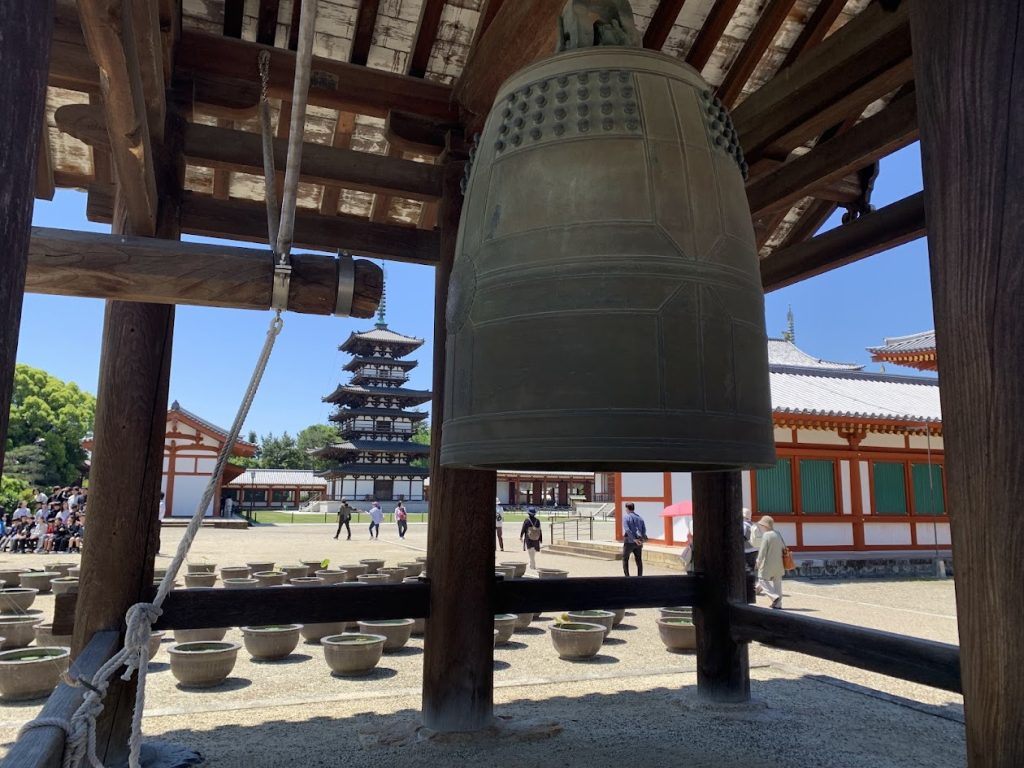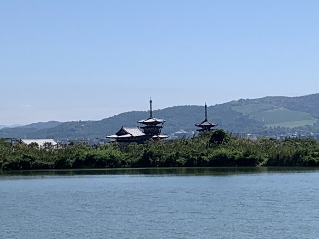 薬師寺の東塔と西塔、そして大講堂の屋根がのぞめます。