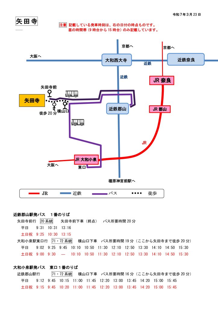 矢田寺へのアクセス|JR大和小泉駅または近鉄郡山駅からバス 行き方(奈良駅から) 2025.09.09 矢田寺のページに戻る 注意下の文書に記載している発車時刻は、文書右上の日付の時点のものです。当日の発車時刻はぜひ、ご自分で確認ください。特に、便数の少ない交通機関は、十分にご注意ください。なお、発車時刻は昼の時間帯のみ記載しています。