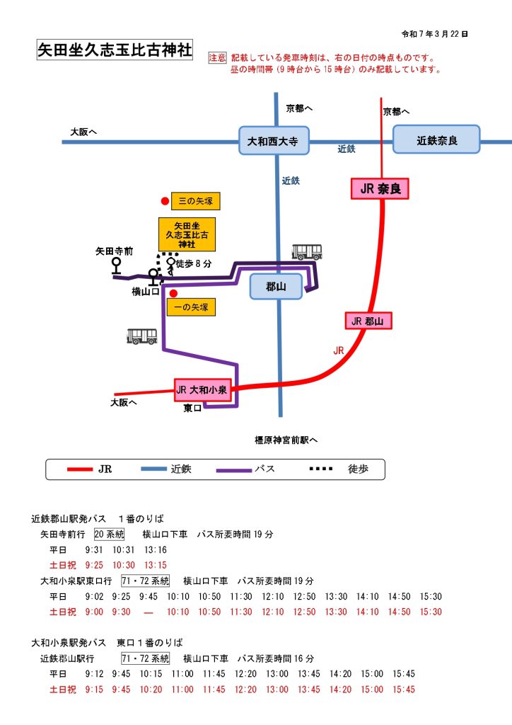 矢田坐久志玉比古神社へのアクセス|奈良駅から近鉄・JR郡山駅経由バス 行き方(奈良駅から) 2025.09.09 矢田坐久志玉比古神社のページに戻る 注意下の文書に記載している発車時刻は、文書右上の日付の時点のものです。当日の発車時刻はぜひ、ご自分で確認ください。特に、便数の少ない交通機関は、十分にご注意ください。なお、発車時刻は昼の時間帯のみ記載しています。